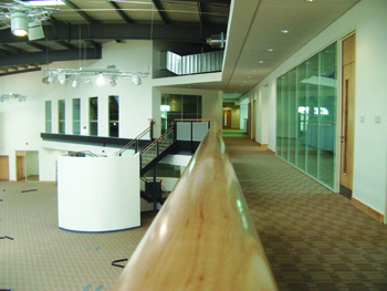 Measuring 142m by 45m, the building has 94,500 sq ft and is formed by a wing-shaped roof. It has two open plan double-height areas for 850 agent positions, one of 450 to the north of the building and 400 in the south. The edge of the building houses offices, training rooms and breakout areas, with a training area on the mezzanine. And a 250-seat cafeteria will be on the upper central balcony, with views over the call centre floors, and a 420-space car park.